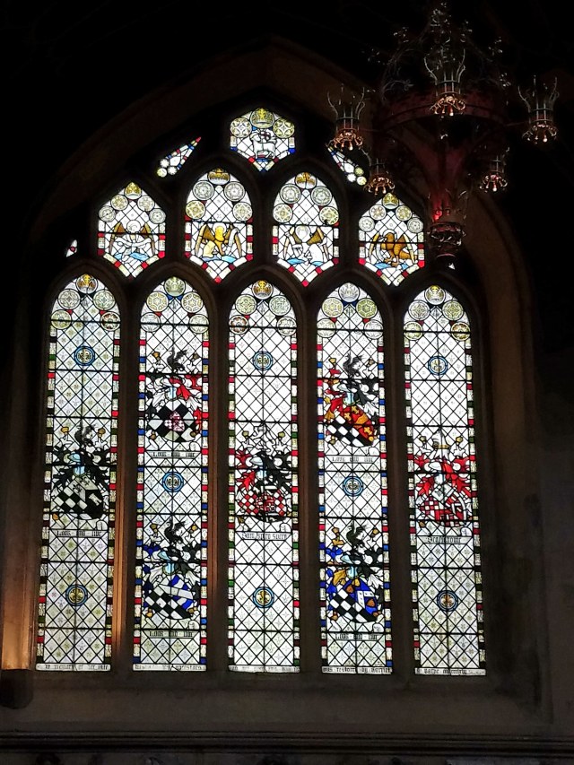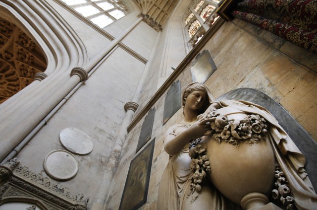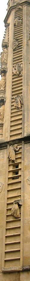 The venerable Bath Abbey (13th century and on) with its fan vaulting and nave ceiling. Note the ladders on the front of the church with angels ascending and descending.